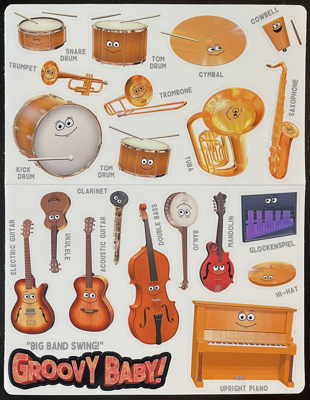 This sticker sheet features the instruments from the Groovy Baby music video "Big Band Swing!"