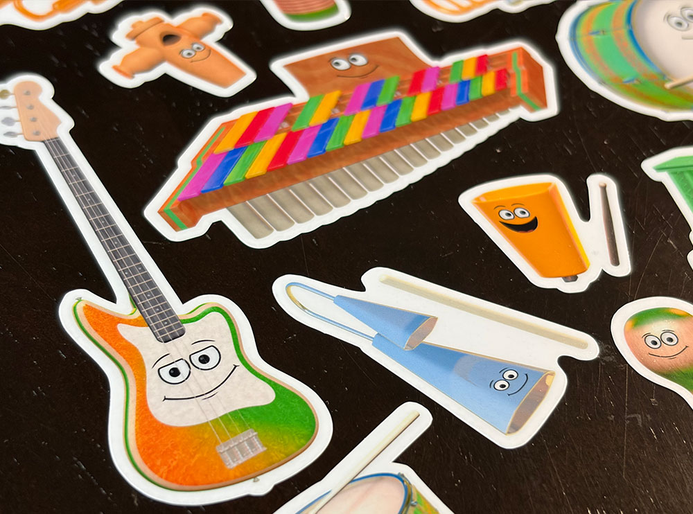 This sticker sheet features the instruments from the Groovy Baby music video "Mambo!"